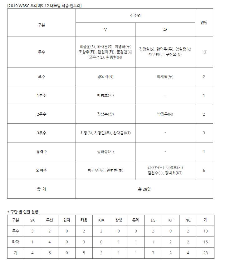 KBO가 2일 내달 2일부터 17일까지 열리는 '2019 프리미어 12' 대표팀(감독 김경문) 명단을 확정 지었다. 총 28명의 선수들이 선발되었고, 투수조 타자 조 모두 멀티 포지션이 가능한 선수들이 대거 발탁되었다. 김경문 감독은 선수 발표 기자회견에서 선발투수보다는 불펜투수를 많이 선발한 이유에 대해, 상대에 따라 변칙적으로 활용한다는 계획을 발표했다